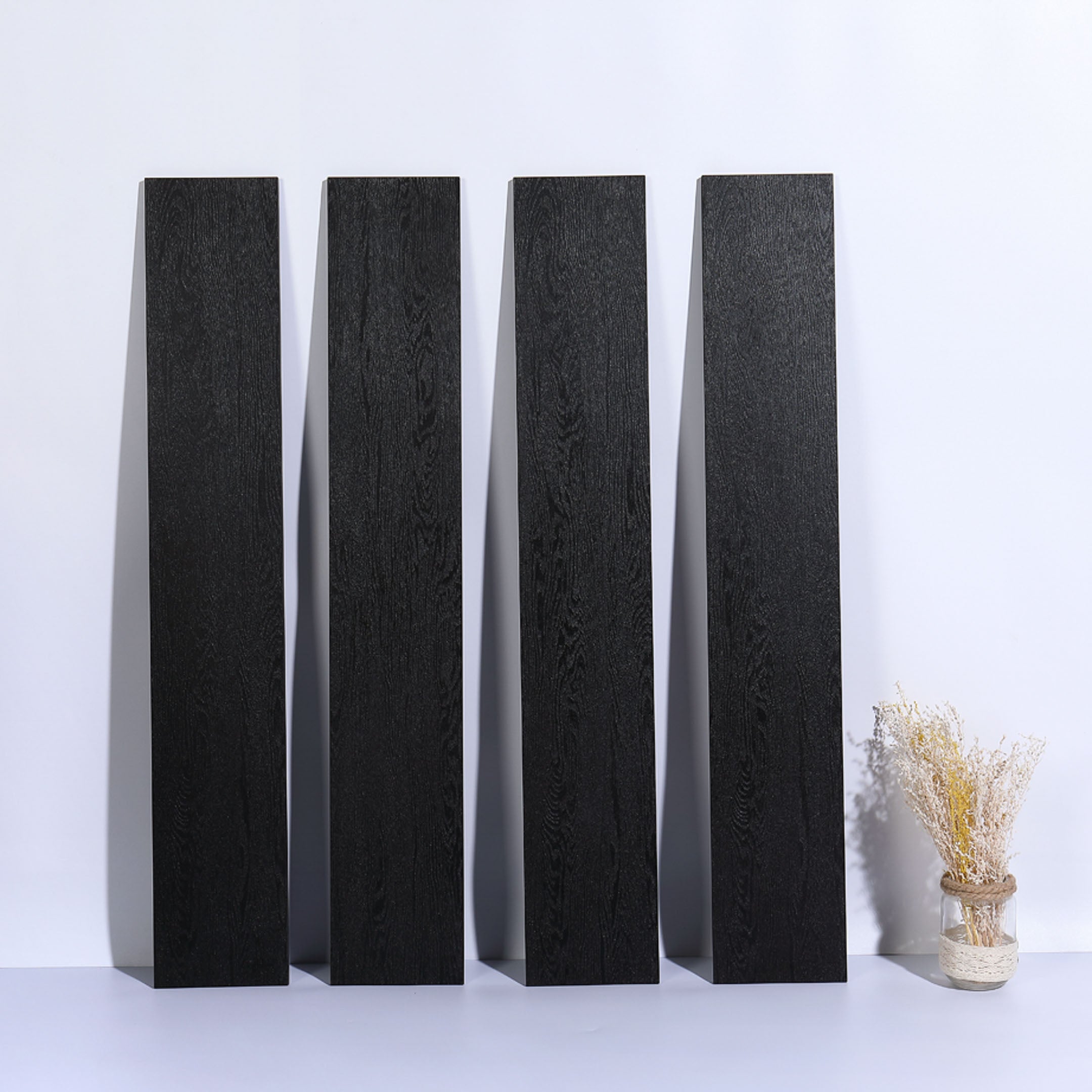 Domus - a through-body rectified porcelain wood look tile. Available in this dark black color and lappato (semi-glossy) finish. A great addition to any interior or exterior application as well as commercial or residential use.