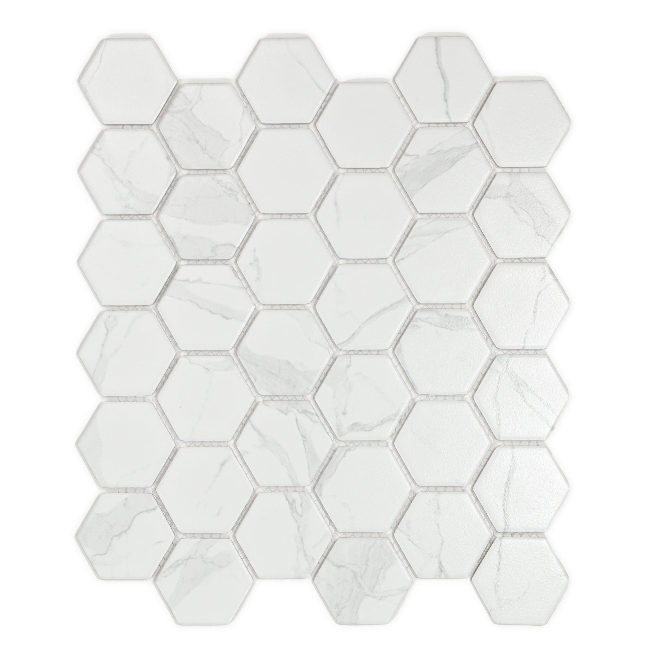 Bode 2" x 2" Hexagon/Honeycomb Mosaic is a porcelain marble Statuario look floor & wall mosaic tile. Available in a matte finish and great for any wall, kitchen, bathroom walls, and backsplash with a contemporary style. Complete your project with coordinating tiles in multiple sizes and shapes from Qube Tiles for style, durability, and easy care. Check out the other tiles in the Bode collection in Statuario, Calacatta, and matte/satin finishes. Additional sizes available.
